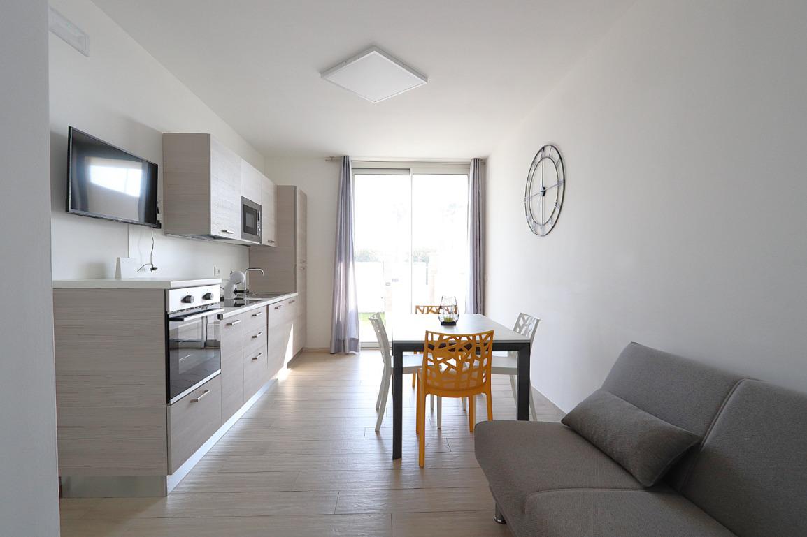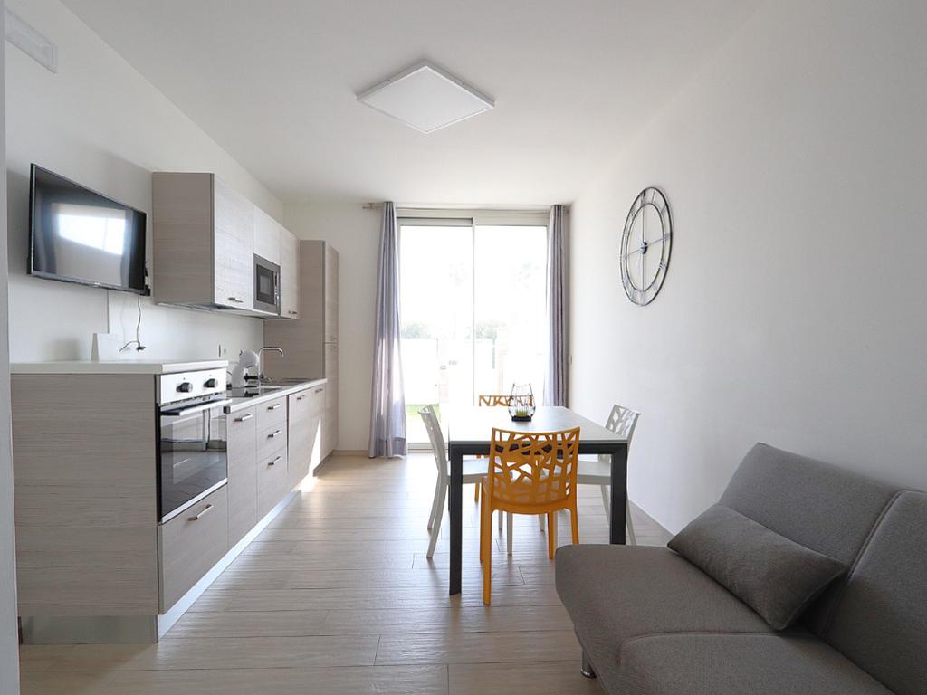 La zona giorno accoglie con un luminoso soggiorno dotato di angolo cottura full electric con piano a induzione, soluzione moderna, sicura ed efficiente che elimina completamente l’utilizzo del gas. La zona notte è composta da due camere matrimoniali e da un bagno finestrato, elegante e funzionale, completo di doccia.